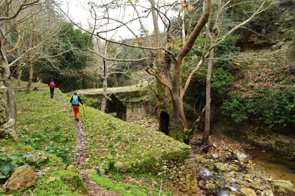 Starting from the main square of Argiroupolis, we gradually make our way through the village on cobbled alleyways and paths admiring the architecture of the Venetian buildings. The old, paved path we follow takes us down to the small chapel of the 5 Holy Virgins built into the rock. Alongside it, there are many rock-cut Roman tombs and huge plane trees, some almost 2000 yrs old!